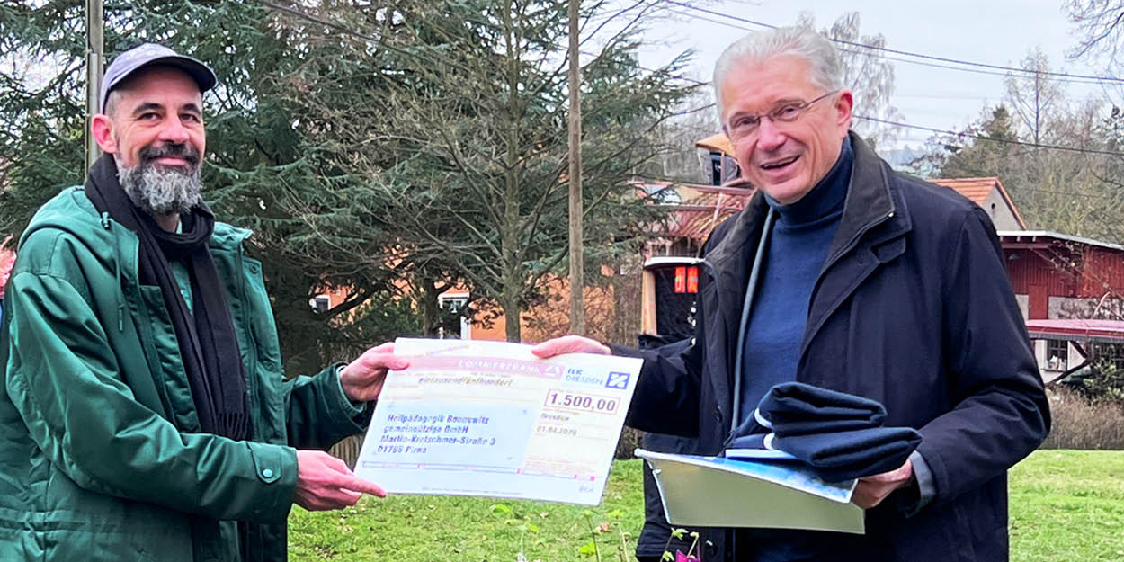 Ungewöhnlich zeitig am Morgen starten Professor Franzke und ich in der Bertolt-Brecht-Allee in Dresden-Striesen. Ungewöhnlich ist auch unser Ziel, das bereits im Navi aufleuchtet. Wir fahren nach Bonnewitz in die Heilpädagogische Schule. Unterwegs, als die Straßen immer schmaler und verwinkelter werden, stellen wir beide fest, dass wir uns in diesen Landstrich, der nebenbei gesagt wunderschön ist, nicht wirklich auskennen. Am Ende der Dorfstraße in Bonnewitz sehen wir die ersten Kinder, eine Villa und zahlreiche Kleinfahrzeuge und Fahrdienste, die in der Auffahrt zur Villa stehen und Kinder mitbringen. Es wimmelt wie in einem Bienenstock. Wir sehen viele Erwachsene, Betreuer, die auf „ihre“ Kinder und Jugendlichen warten. Dieser Ort ist ein Ort für besondere Kinder und ein besonderer Anlass hat uns heute hierhergeführt – eine Spendenübergabe. Wir fragen uns nach dem Schulleiter durch. „Den finden Sie dort hinten im zweiten Bauwagen.“, eine Betreuerin zeigt uns den Weg. In diesem Moment kommt uns Herr Böttcher-Farago mit Basecap und Parka auch schon entgegen und wieder wird unser Kopfkino über Bord geworfen. „So einen Schulleiter hätte ich mir früher immer gewünscht.“, denke ich noch bei mir, als wir in der Schul-Cafeteria einen Cappuccino zapfen und die verbleibenden zehn Minuten bis zum Start des Morgenkreises überraschenderweise mit einer ehemaligen ILK Dresden Mitarbeiterin verplaudern.