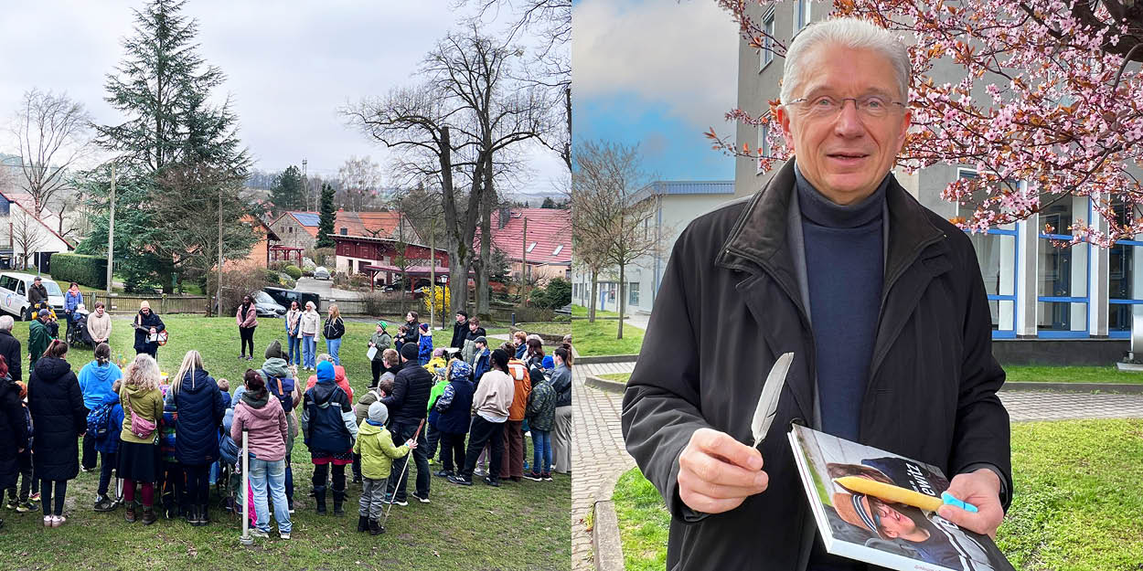 Wo gerade noch die Fahrdienste wuselten, auf der großen Wiese vor der Villa, kehrt Ruhe ein. Relativ schnell und doch entspannt formt sich ein Kreis von etwa einhundert Kindern und Erwachsenen. In der Mitte steht ein junger Mann. Er stimmt mit seiner Gitarre ein Morgenlied an. Kurz darauf beglückwünscht Herr Böttcher-Farago alle Geburtstagskinder dieser Runde. Er geht persönlich auf seine Schützlinge zu, überreicht ihnen eine Kerze und eine gebastelte Glückwunschkarte. Die Kinder strahlen. Obwohl die Temperaturen morgens halb neun am Rande der Sächsischen Schweiz kaum über null sind, empfinden wir eine unsagbare Wärme und Herzlichkeit. Mit meiner Handykamera komme ich mir ein bisschen wie ein Fremdkörper vor. Professor Franzke fängt die besondere Atmosphäre sehr schnell ein und richtet seine kurze Ansprache sofort auf die Kinder aus. Sie mögen immer neugierig bleiben, neugierig wie die Menschen, die an unserem Institut arbeiten. Vielleicht ist uns beiden in dieser kurzen halben Stunde hier vor Ort klar geworden, dass unsere Spende in Höhe von 1.500 Euro einfach nur eine abstrakte Zahl und ein „kleiner Tropfen auf den heißen Stein“ ist. Das viel Wertvollere für uns ist der Moment an diesem Ort und unsere Dankbarkeit an alle helfenden Hände – sowohl hier als auch an die Spendenden am ILK Dresden.