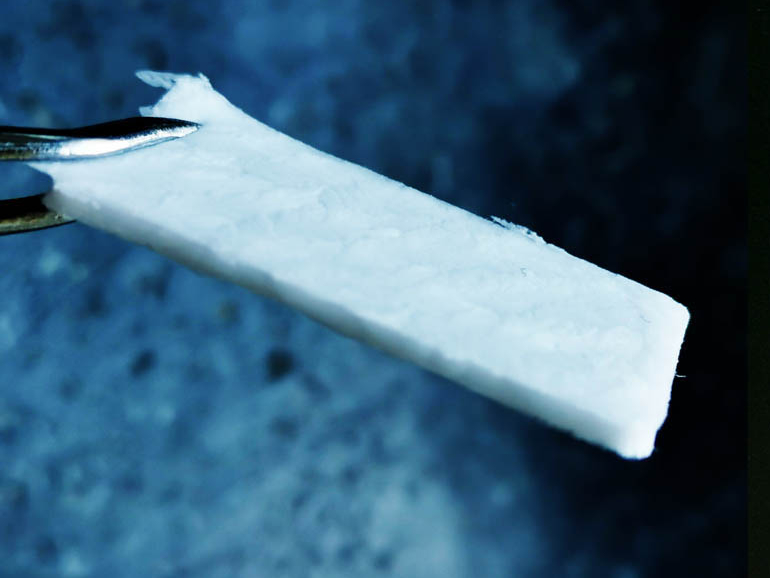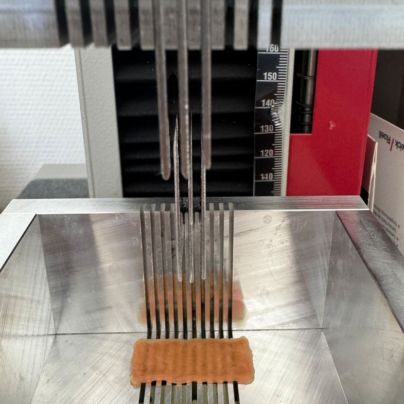 Unter Einsatz des MbIT-Verfahrens wurden aus dem tierischen Strukturprotein Kollagen poröse Trägerstrukturen für die Kultivierung tierischer Zellen zu einem künstlichen Fleischprodukt erzeugt. Dazu wurden verschiedene Kollagensuspensionen in selbst entwickelten Einfrierformen auf der Stellfläche eines Gefriertrockners eingefroren und anschließend gefriergetrocknet. Durch eine passende Gefrierform und eine gut abgestimmte Temperaturführung kann das Eiswachstum so gesteuert werden, dass wahlweise eine kurze, wabenartige Porenstruktur oder langgestreckte, lamellenförmige Porenräume entstehen. So lassen sich verschiedene Materialstrukturen erzeugen, die längs- und quergeschnittenes Muskelfleisches imitieren. Die Festigkeit der Scaffolds wurde über den Proteingehalt und die erzeugte Porengröße der Scaffolds variiert und durch eine thermische Nachbehandlung zur Quervernetzung der Proteinmoleküle weiter erhöht. Anschließend wurden Bissverhalten und Festigkeit der erzeugten Trägermaterialien mit einer Kramer-Scherzelle bestimmt und mit einer Datenbank für Fleischprodukte verglichen. Abhängig vom Proteingehalt entsprach die erzeugte Bissfestigkeit der befeuchteten Scaffolds der von Hühner- oder Schweinefleisch. Im weiteren Projektverlauf wurden die Scaffolds mit Muskelzellen besiedelt, um Fleischäquivalente zu erzeugen. Diese sollen nun schrittweise optimiert werden, um ihre Textur und Festigkeit detailgetreu an die Werte verschiedenster Fleischsorten anzupassen.