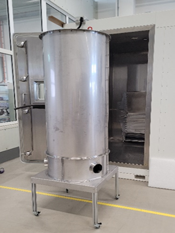 Zur Herstellung des Strahlguts in geeigneter Geometrie und mit passender Temperatur ist ein gut angepasster, Tieftemperatur-Prozess erforderlich. Die Auslegung erfolgte mittels thermodynamischer Simulationen, welche als Grundlage zur Konstruktion und zum Aufbau des Eisspeichers innerhalb der Strahlanlage dienten.