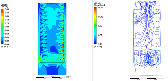 Im Zuge der iterativen Verbesserung der Strömungsführung wurden unter anderem zusätzliche Bohrungen im Mantel des inneren Behälters des Eisspeichers modelliert. Diese führen zu einer deutlich homogeneren Strömung als in den zuvor betrachteten Varianten. Diese weist geringere Geschwindigkeiten auf als vorher erzielte Maxima, genügt jedoch zum Gefrieren und zur Unterkühlung der Eispartikel. Die Trajektorien zeigen eine erwünschte Verwirbelung unmittelbar vor Erreichen des Behälterbodens, was einerseits als unkritisch hinsichtlich sonst auftretender Agglomerationserscheinungen einzuschätzen ist und andererseits die gewünschte Unterkühlung absichert.