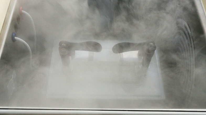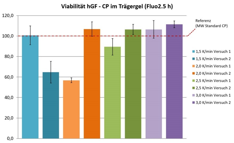 Nach einjährigen Bearbeitungszeit konnte ein gut verträgliches Trägergel auf Basis natürlicher, gewebetypischer Biopolymere entwickelt werden, das eine mehrtägige Kultivierung menschlicher Hautzellen ermöglicht. Dabei konnte vollständig auf die Verwendung problematischer Gefrierschutzadditive verzichtet werden. In umfangreichen Versuchen wurde die Viskosität des Trägergels so optimiert, dass es fest genug ist, um eine stabile dreidimensionale Zellverteilung in der Wunde zu ermöglichen. Gleichzeitig ist es flüssig genug, um unter leichtem Druck mit einer Spritze in der Wunde verteilt zu werden. In umfangreichen Versuchen wurde der Einfrier- und Auftauprozess so optimiert, dass nach der Kryokonservierung eine ausreichende Gelfestigkeit erhalten bleibt. Nach einer speziellen kryoprotektiven Vorkultivierung wurden menschliche Spenderzellen in das Trägergel eingebracht. Mit einem selbst entwickelten Freezing-Rack und darauf abgestimmten Einfrierprogrammen gelang es, dass zellhaltige Trägergel erfolgreich zu kryokonservieren. Bis zu 100 % der kryokonservierten Spenderzellen aus menschlichem Hautgewebe (dermale Fibroblasten) überlebten den Einfrier- und Auftauprozess in einer Zellkulturplatte. Aufgrund der positiven Resultate sollen nun auch bald therapeutische Zellen der Projektpartner kryokonserviert werden. Nach einer erfolgreichen Kryokonservierung werden diese Zellen dann auch in einer Produktspritze eingefroren. Nach dem Auftauen soll an zwei In vitro – Modellen untersucht werden, ob die Zellen die Kryokonservierung nicht nur überleben, sondern sich anschließend weiter vermehren und Wunden verschließen können.