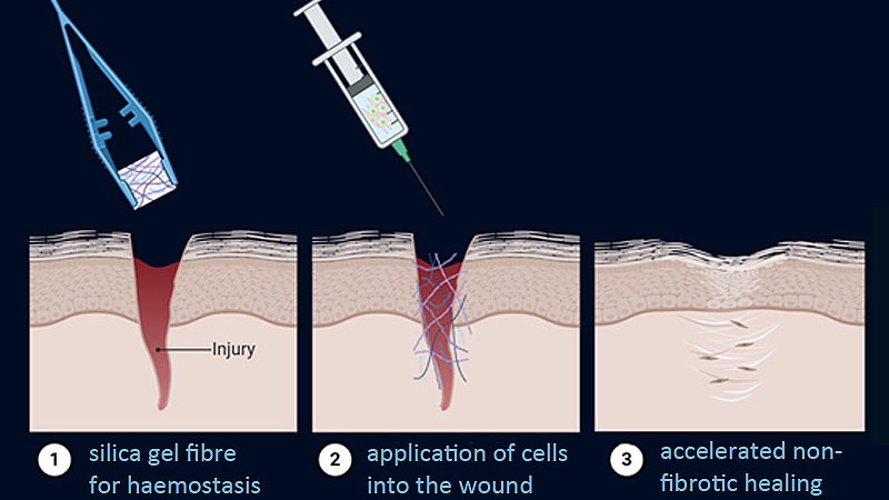 Das Kooperationsprojekt mit dem Fraunhofer Institut für Silikatforschung (ISC), dem dort angesiedelten Translationszentrum für Regenerative Technologien (TLZ-RT) und dem Fraunhofer Institut für Toxikologie und Experimentelle Medizin (ITEM) dient der Entwicklung einer neuartigen Wundbehandlungstechnologie, die speziell auf die Herausforderungen der Raumfahrt ausgerichtet ist. Der Behandlungsansatz kombiniert eine blutungsstillende, biologisch abbaubare Wundeinlage mit einem kryokonservierbaren Zelltherapeutikum und vereint Aspekte der Materialforschung, Somatischen Zelltherapie und Kryobiologie. Die Projektbearbeitung erfolgt arbeitsteilig, wobei jeder Projektpartner seine fachspezifische Expertise einbringt: Das ISC entwickelt auf Basis moderner Spinnverfahren ein biologisch abbaubares Faservlies mit blutungsstillender Beschichtung für den Wundverschluss. TLZ-RT und ITEM erzeugen aus pluripotenten Stammzellen polarisierte Hautzellen, die für einen narbenfreien Wundverschluss sorgen und heilungsfördernde Immunzellen, welche die Wunde reinigen und Infektionserreger beseitigen. Das ILK Dresden entwickelt ein hochviskoses Zellträgergel, mit dem die therapeutischen Zellen in die Wunde eingebracht werden. Nach dem Blutungsstopp wird das Gel mit einer kleinen Spritze in das Faservlies appliziert. Es sorgt für eine gleichmäßige Verteilung der Zellen, stellt ein wachstumsförderndes Umfeld her und versorgt die Zellen mit den benötigten Nährstoffen und Wachstumsfaktoren. Gleichzeitig dient es als biologisches Gefrierschutzmittel und ermöglicht eine lebenserhaltende Kryokonservierung der therapeutischen Zellen. Mit Hilfe dieses multifunktionalen Gels werden diese am ILK Dresden lebenserhaltend eingefroren, um auch lange Weltraummissionen unbeschädigt im Kälteschlaf zu überdauern. Nach dem Auftauen der Spritze ist das Therapeutikum in wenigen Minuten einsatzbereit und kann verabreicht werden.